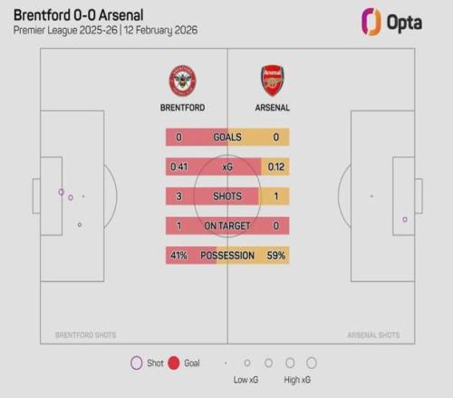 Opta统计,阿森纳和布伦特福德两队加起来在上半场只有4脚射门(3脚还是对方贡献的),本赛季英超比赛中只有去年12月狼队对布伦特福德的比赛上半场双方射门次数更少(3次)。