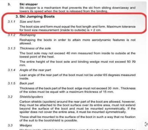 国际雪联(FIS)对跳台滑雪靴子的厚度,高度,楔子,贴合度都有严格的规定,其中最重要一条: