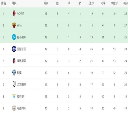 在积分榜上,AC米兰以28分,超越罗马登顶。27分的罗马屈居第2。不过,罗马比AC米兰少赛一场。那不勒斯以25分排名第3。第4的是国际米兰,拿到24分。博洛尼亚和科莫也是24分,排名第5和第6。尤文图斯赢球之后,总积分达到23分,排名第7。前7名的球队差距都很小,最多也就差5分,都有冲击冠军的希望。