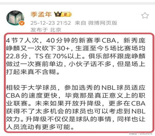 庞峥麟单场砍下30+,也让媒体人季孟年大加赞赏,他在个人社媒上评论道“峥麟又一次砍下30+,生涯至今5场比赛场均22.8分,TS在70%以上。俱乐部杯跟庞峥麟做过一次赛前单边,小伙子话不多,但是场上打起来真不含糊。相较于大学球员,参加选秀的NBL球员适应CBA的速度更快,毕竟那是真正意义上的职业联赛。”。